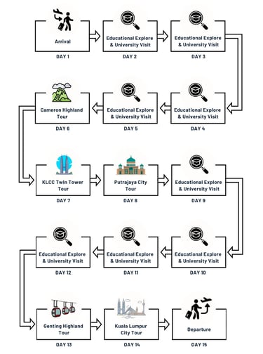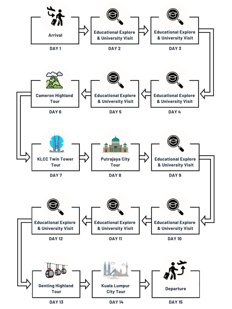 The itinerary includes visits to iconic landmarks like the Kuala Lumpur Tower, Twin Towers, Putra Mosque, and BOH Tea Plantation. A trip to Genting Highlands allows students to experience the Genting Skyway and enjoy breathtaking views.